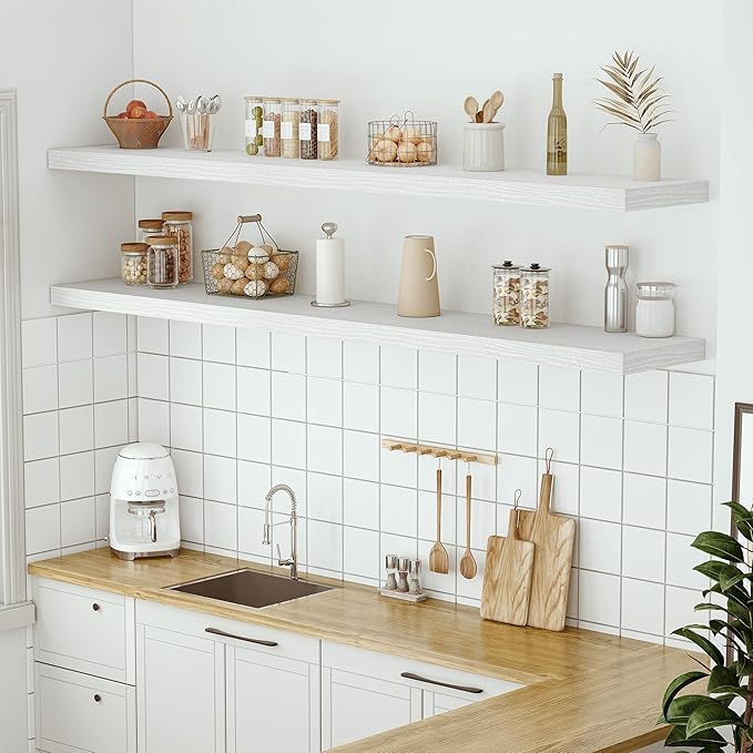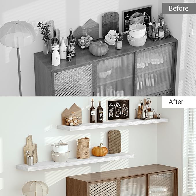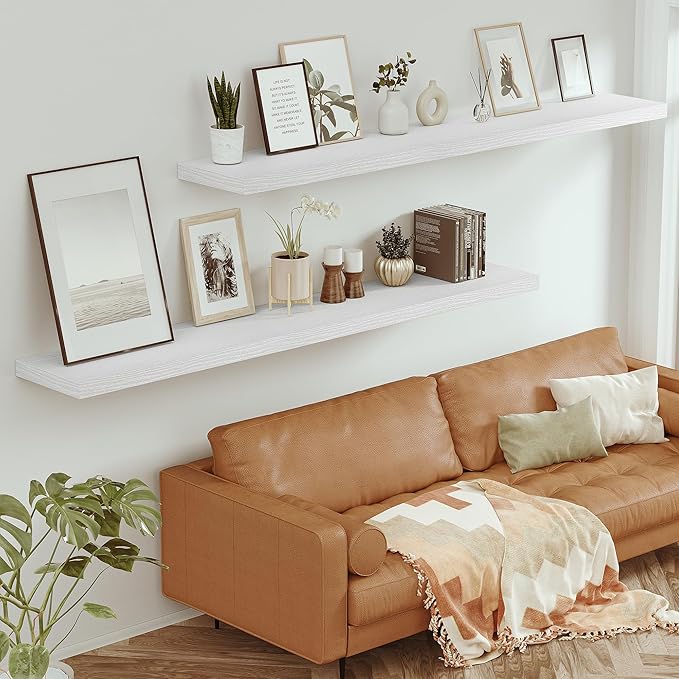 - Well-designed Floating Shelves - The rustic style floating shelves combining both practicality and style. These shelves offer a generous deeper and thicker surface, perfect for organizing daily sundries without taking up valuable floor space. The various of selected colours finish adds a cozy, natural element,display your art pieces on the wall to decorate your home, and make it full of aesthetic flare.