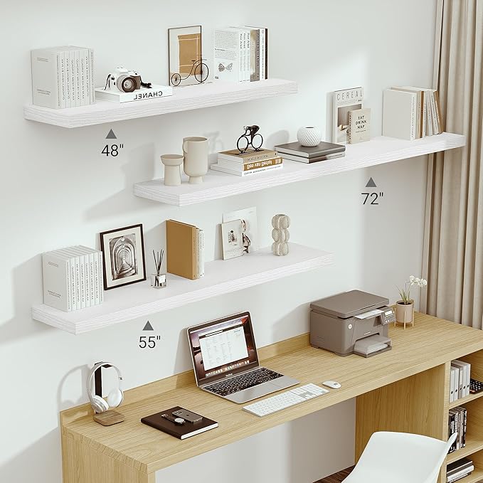 - Extra Deeper & Thicker Wood Floating Shelves - Each wall shelf measures 72"W x 12"D x 2"H. Our shelves for wall decor create a variety of storage spaces to organize small items on your desktop or counter.and they blend seamlessly with the rest of other decor and provide a stylish way to organize and display items.It would highly recommend for succulents, small items, and collectibles, statues and trophies, or anything you would like to display