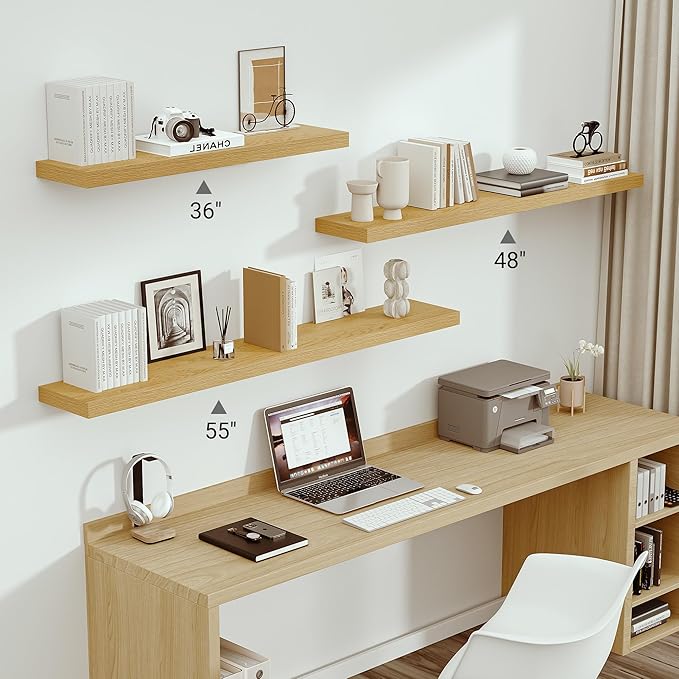 - Extra Deeper & Thicker Wood Floating Shelves - Each wall shelf measures 55"W x 10.3"D x 1.8"H. Our shelves for wall decor create a variety of storage spaces to organize small items on your desktop or counter.and they blend seamlessly with the rest of other decor and provide a stylish way to organize and display items.It would highly recommend for succulents, small items, and collectibles, statues and trophies, or anything you would like to display