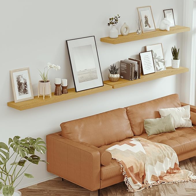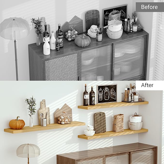 - Well-designed Floating Shelves - The rustic style floating shelves combining both practicality and style. These shelves offer a generous deeper and thicker surface, perfect for organizing daily sundries without taking up valuable floor space. The various of selected colours finish adds a cozy, natural element,display your art pieces on the wall to decorate your home, and make it full of aesthetic flare.