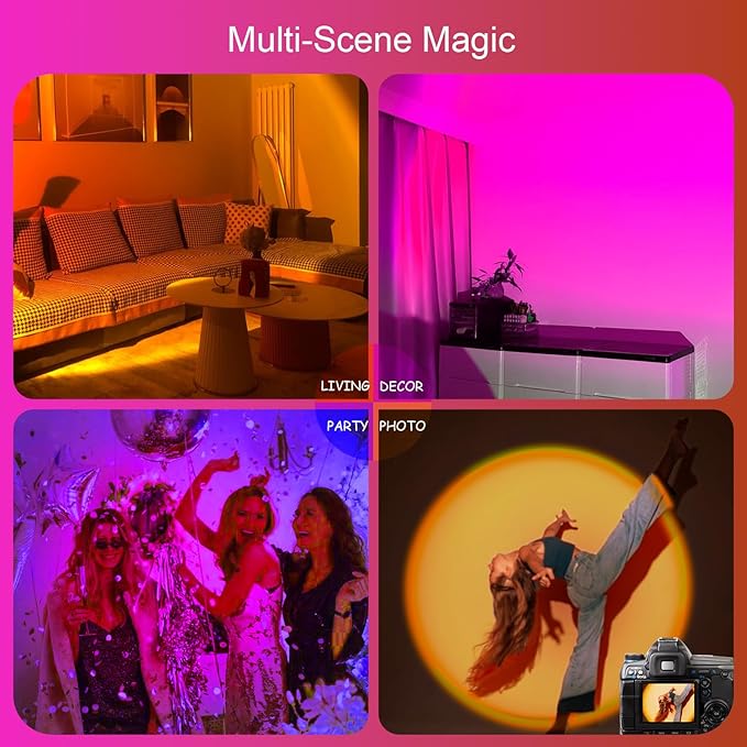- 7 Static Colors & 4 Modes with Remote:Control 7 static colors, 4 dynamic modes, brightness, and speed via remote! Add music sync for parties or chill with sunset gradients—no app needed!Unlike basic single-color lamps, our sunset lamp projector offers 7 vibrant RGB hues + 4 sunset gradients—switch between party vibes, calming sunsets, or romantic candlelight with one button. Perfect for mood lighting, gaming nights, or live-streaming backgrounds. Why settle for one color when you can own the whole sunset spectrum?