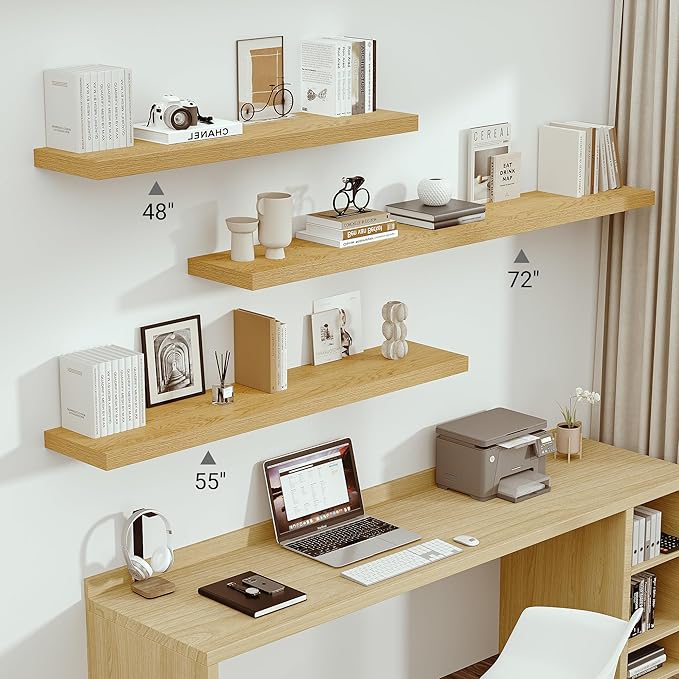 - Extra Deeper & Thicker Wood Floating Shelves - Each wall shelf measures 72"W x 12"D x 2"H. Our shelves for wall decor create a variety of storage spaces to organize small items on your desktop or counter.and they blend seamlessly with the rest of other decor and provide a stylish way to organize and display items.It would highly recommend for succulents, small items, and collectibles, statues and trophies, or anything you would like to display