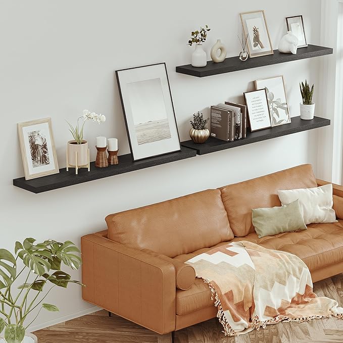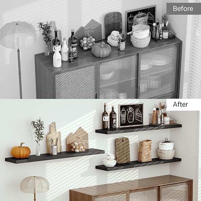 - Well-designed Floating Shelves - The rustic style floating shelves combining both practicality and style. These shelves offer a generous deeper and thicker surface, perfect for organizing daily sundries without taking up valuable floor space. The various of selected colours finish adds a cozy, natural element,display your art pieces on the wall to decorate your home, and make it full of aesthetic flare.