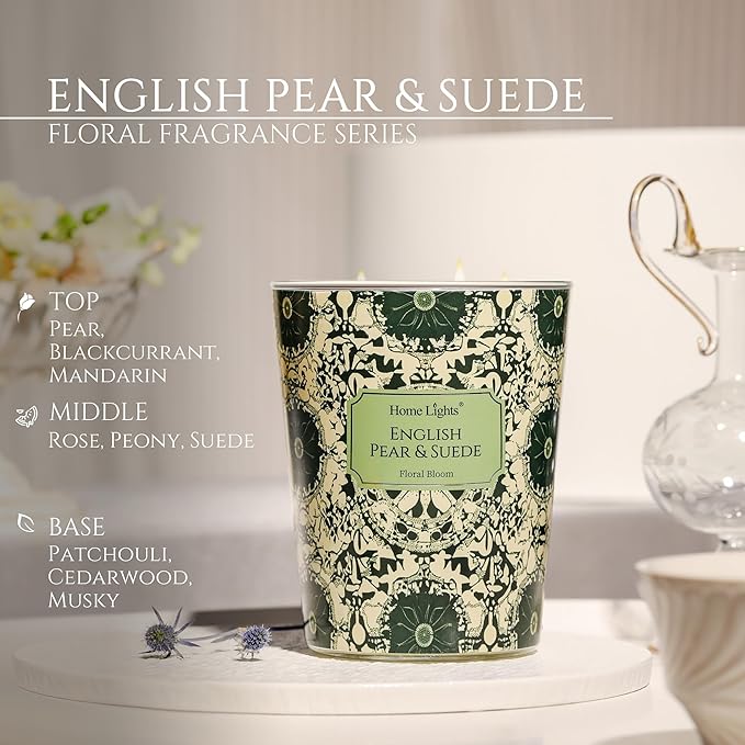 - 【English Pear & Suede Fragrance for Relaxation】3-Wick Candles capture the essence of English Pear & Suede with its fresh, juicy top notes of ripe pear, a heart of soft suede, and a warm, woody base of amber and patchouli. Perfect for cultivating a serene ambiance in living rooms, bedrooms, or bathrooms.