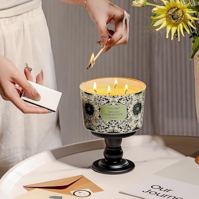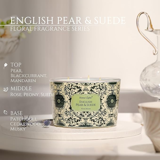 HomeLights Soy Wax Candles for Home Scented, 4-Wick Candles in English Pear & Suede Scented, Aromatherapy Candles Gift for Parties, Relaxing, Bohemian Natural Textures, 18oz