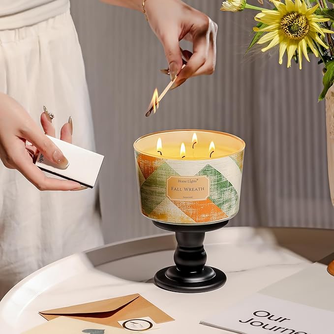 HomeLights Soy Wax Candles for Home Scented, 4-Wick Candles in Fall Wreath Scented, Rustic Modern Aromatherapy Candles Gift for Parties, Relaxing, 18oz