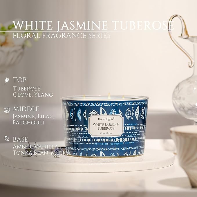 HomeLights Scented Candles for Women & Men, 18oz Candle Jars Aromatherapy 4-Wick Candle, Ideal for Bohemian Natural Textures Home Decor and Gifts, White Jasmine Tuberose