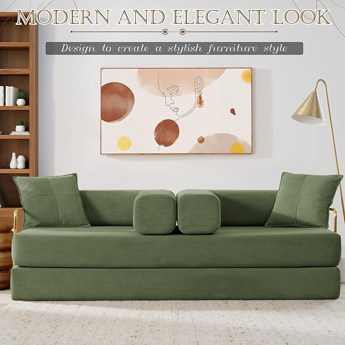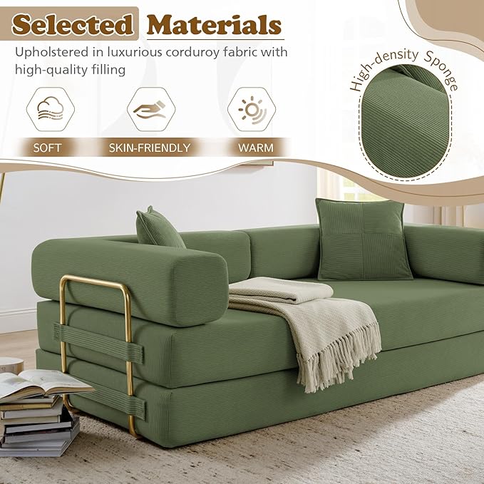 Antetek Convertible Futon Sofa Bed, 3-Seater Modern Corduroy Foam Floor King Size Bed Fold Out Sleeper Lounge Loveseat Sofa Couch with 2 Throw Pillows for Living Room Bedroom Guest Room, Army Green