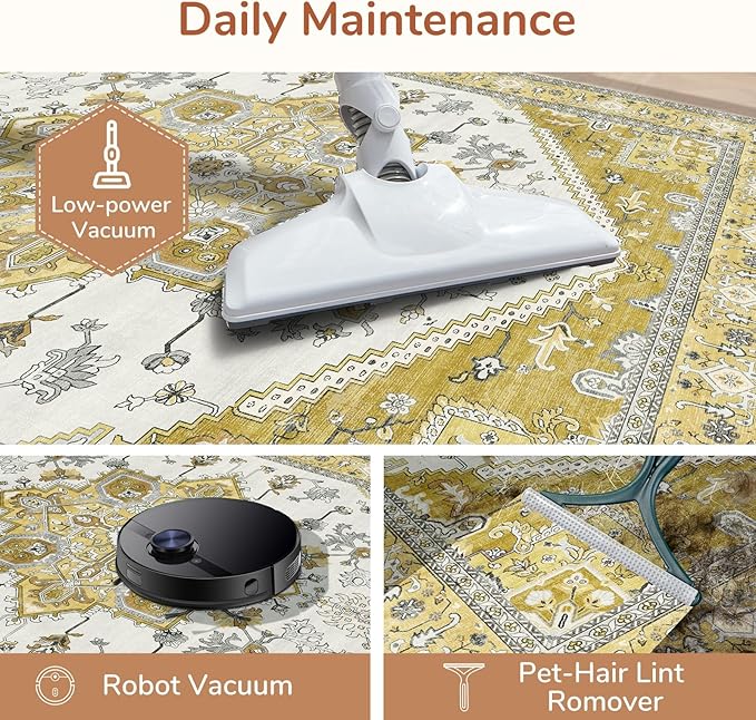 OPPODREAM Thin Area Rugs 9x12 Living Room, Washable Rugs 9x12 with Non Slip Backing, Faux Cashmere Low-Pile 9 x 12 Carpet, Yellow