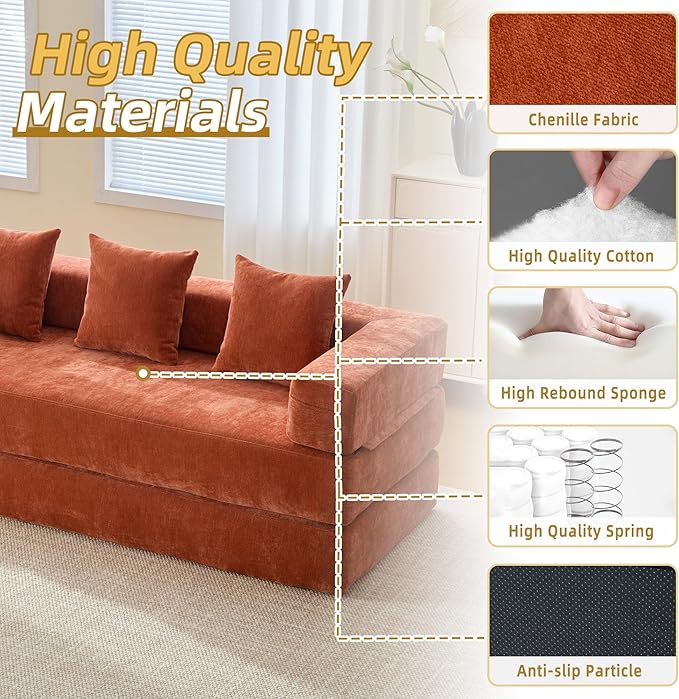 Convertible Floor Sofa Bed with Storage Pocket, Chenille Folding Mattress Sofa with Zipper Closure, Floor Lounge Couch for Living Room, Bedroom, Studio -Burnt Orange