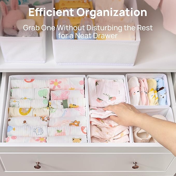 - 【Make Your Clothes More Organized】The largest organizer bins are good for bras, shirt, pants, baby clothes. The medium rectangle bins are good for underwear, lingerie, scarf, baby bibs. The small bins are good for socks, ties, and little stuffs. And the drawer organizers are suitable for closet, dresser, baby room, bedroom and more.
