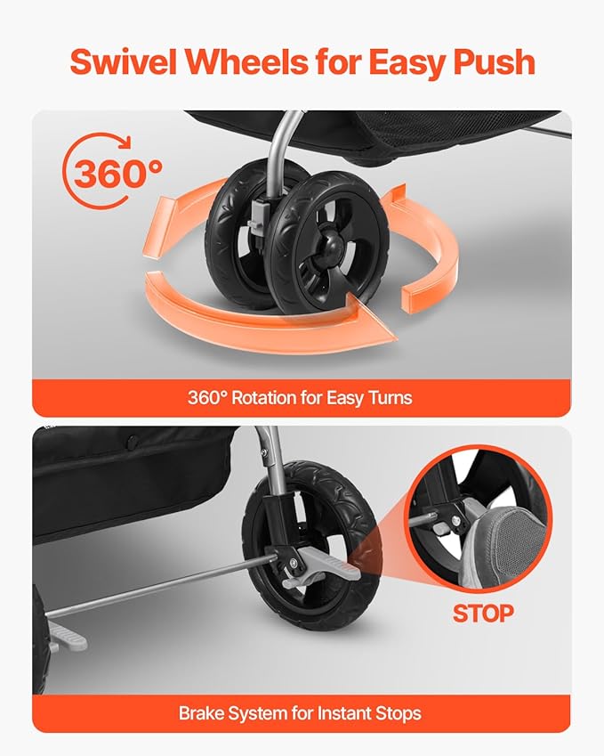- Smooth and Stable Mobility: Featuring 6-inch EVA foam wheels for shock absorption, this foldable pet stroller offers versatility across grass, sidewalks, and sand. A 360Β° rotating front wheel ensures easy navigation, while rear brakes provide security during stops.