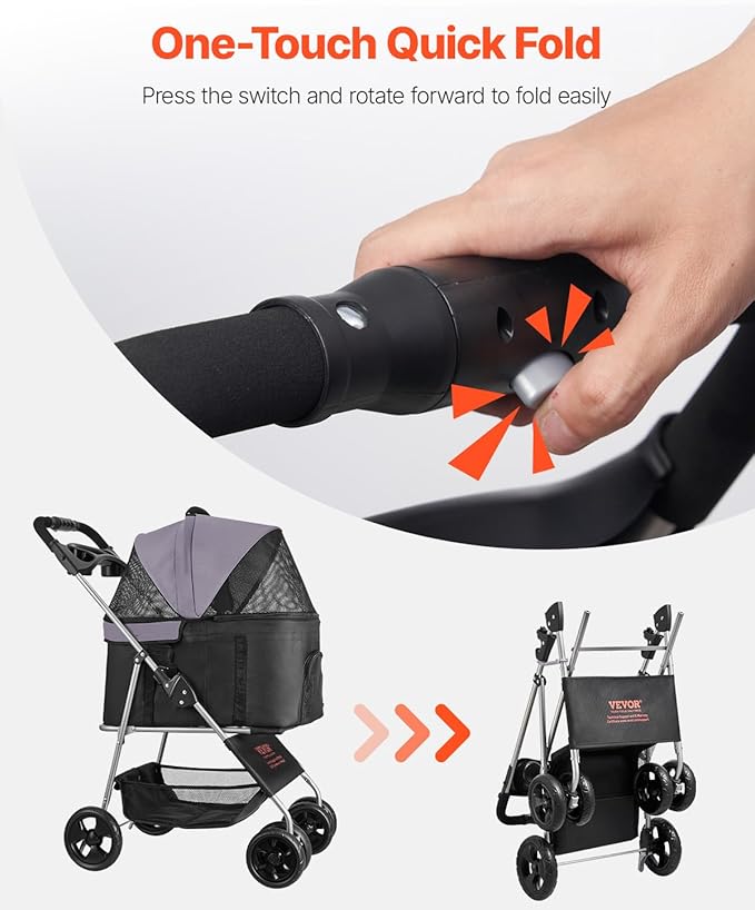 - Quick One-Hand Fold: Effortlessly fold the pet stroller for dogs with a single hand for compact storage. It fits easily into your car trunk or small spaces at home, ideal for travel, outings, or daily use.
