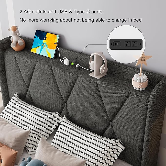 - Charging & Storage Convenience: 2 AC outlets and 1 USB & 1 Type-C port on the headboard, freely charging headphones, tablet, no need to get out of bed to search for available outlets. Besides, 4" storage space at the top is easy to put phone, remote control