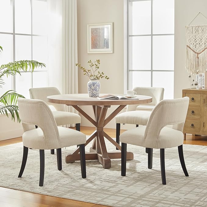 VKNOW Wooden Dining Chairs Set of 4, Modern Fabric Upholstered Dining Room Chair Kitchen Chairs, Farmhouse Dinner Chair for Kitchen Dining Room, Beige-Black Legs