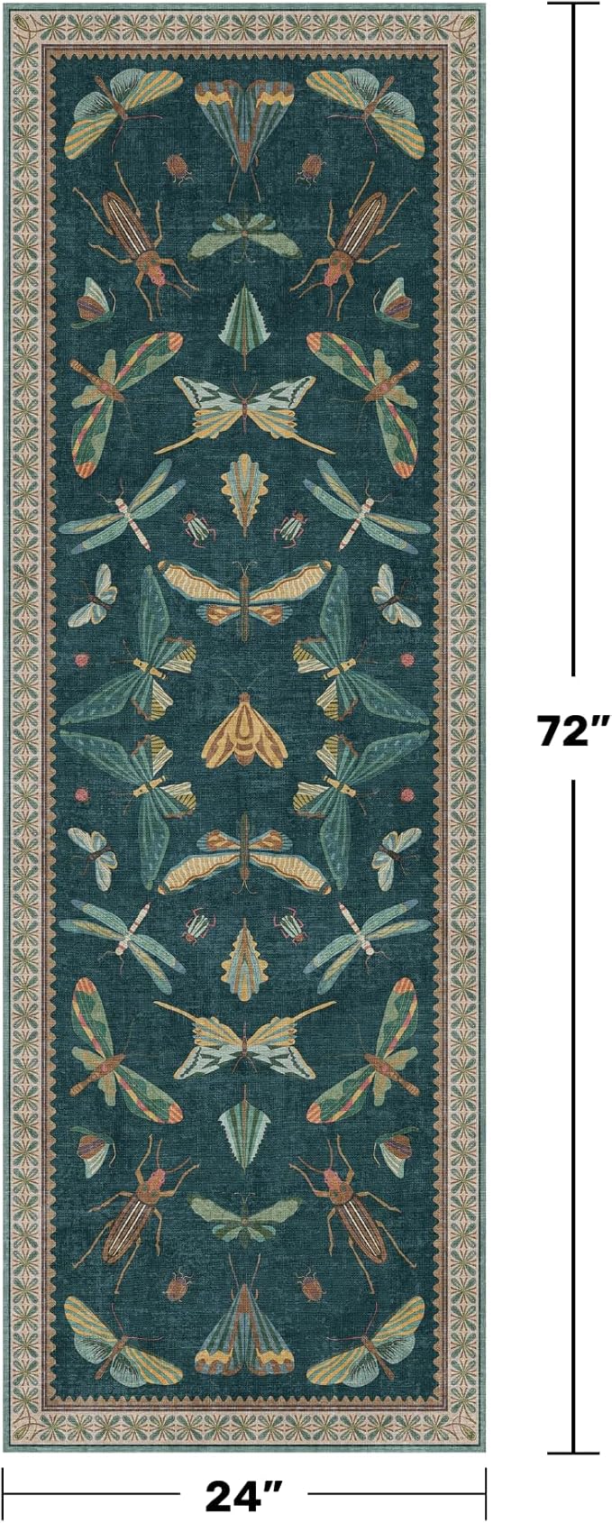 - Unique Vintage Aesthetic: This area rug features a whimsical insect motif with butterflies, dragonflies, and beetles arranged in a mirrored, kaleidoscopic layout. Set against a rich teal background, the design pops with warm yellow, green, and rust accents. The scalloped inner border and vintage floral edging add a handcrafted charm. Perfect for eclectic, boho, or nature-inspired spaces, this rug brings playful elegance and natural curiosity into any room