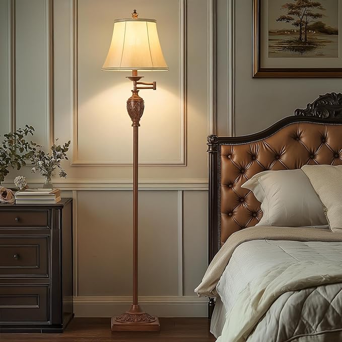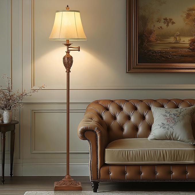 Traditional LED Floor Lamp with 350° Adjustable Swing Arm Lamp – Vintage Standing Pole lamp for Living Room, Bedroom and Office – Rustic Upright Floor Light for Home Décor with Faux Silk Fabric Shade