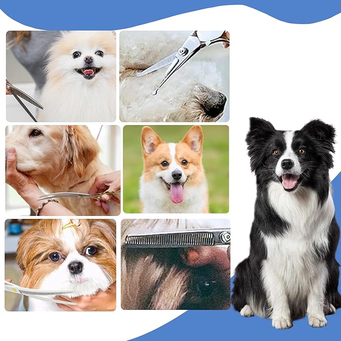 - 【PROFESSIONAL DOG GROOMING SCISSORS SET】This Dog Grooming Set Includes 1 Thinning Scissor, 1 Curved Scissor, 1 Straight Scissor, 1 Grooming Comb, And 1 Storage Case. Perfectly Designed For Trimming And Styling Your Dog’s Or Cat’s Fur.