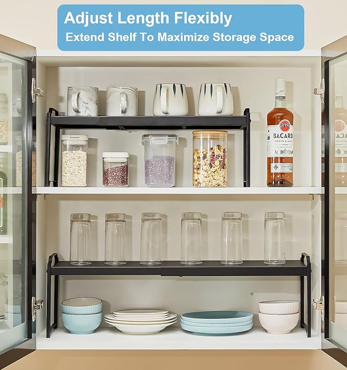 - 【𝗠𝗮𝘅𝗶𝗺𝗶𝘇𝗲𝗱 𝗩𝗲𝗿𝘁𝗶𝗰𝗮𝗹 𝗦𝗽𝗮𝗰𝗲 𝗮𝗻𝗱 𝗞𝗲𝗲𝗽 𝗔𝗹𝗹 𝗕𝗲 𝗢𝗿𝗴𝗮𝗻𝗶𝘇𝗲𝗱 】: ---With Our expandable and stackable cabinet shelf organizer, you can make full use of vertical space. It will be a good choice as a organizer for cups dishes/spice bottles/cans or other kitchen supplies. Keep all of your items be organized and away from mess.
