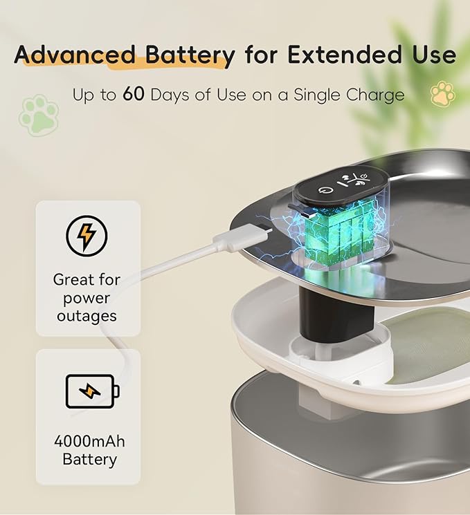 - Cordless Freedom: Place anywhere: keep your kitty hydrated without outlet limits. WILKIEE wireless cat water fountain features a built-in 4000 mAh battery that provides up to 60 days of fresh, filtered water on a single charge. Comes with a charging adapter & chew-proof cable — never worry about chewed wires again