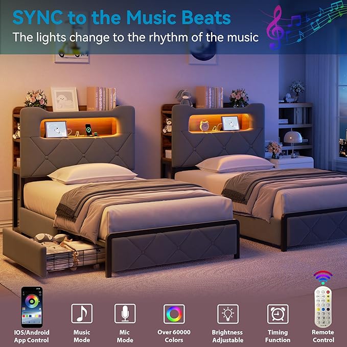 - SMART RGB LIGHTS WITH MUSIC SYNC: This twin bed frame with built-in RGB LED headboard transforms your bedroom with over 16 million colors, 20+ light effects, and dynamic modes controlled by app or remote. Bold lights sync with music, setting the ideal vibe for relaxing, reading, or entertaining. From gentle nightlight for kids to vivid party colors, this velvet bed frame makes every moment magical with immersive ambiance