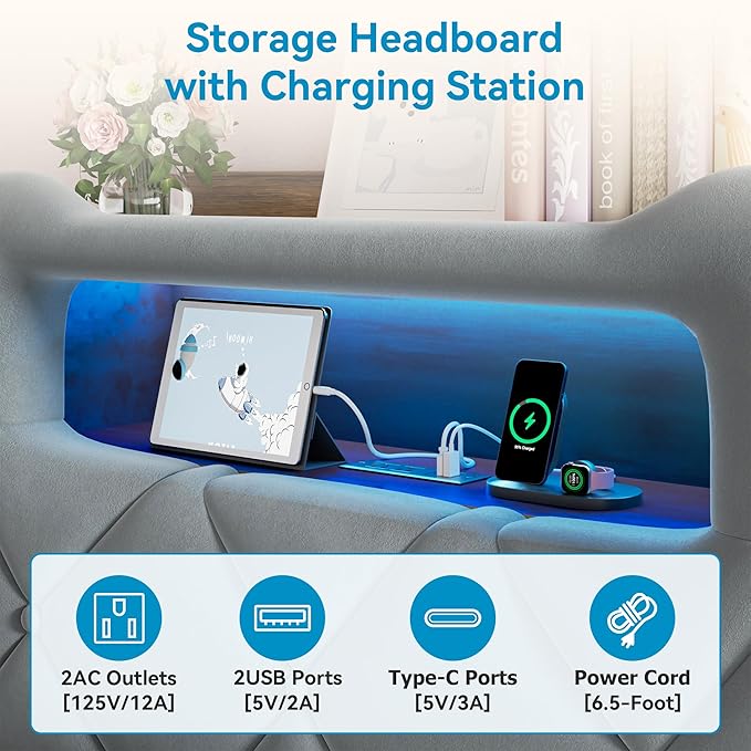 - CHARGING STATION & 2-TIER HEADBOARD STORAGE:This princess bed offers not only comfortable upholstery and an elegant look but also added more convenience. The twin bed frame with charging station features two AC outlets, two USB ports, and one Type-C port right on the headboard, so your devices stay powered up without leaving bed. The 8.5" wide double-layer shelf offers ample bedside storage, like a mini bookcase, while the 11.8" deep side cubby keeps essentials within easy reach