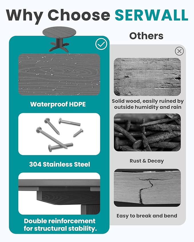 - [Structural Stability and Durability]: SERWALL outdoor round coffee table base is designed with independent support. The outdoor coffee table top is reinforced at the bottom to provide superior strength and durability.