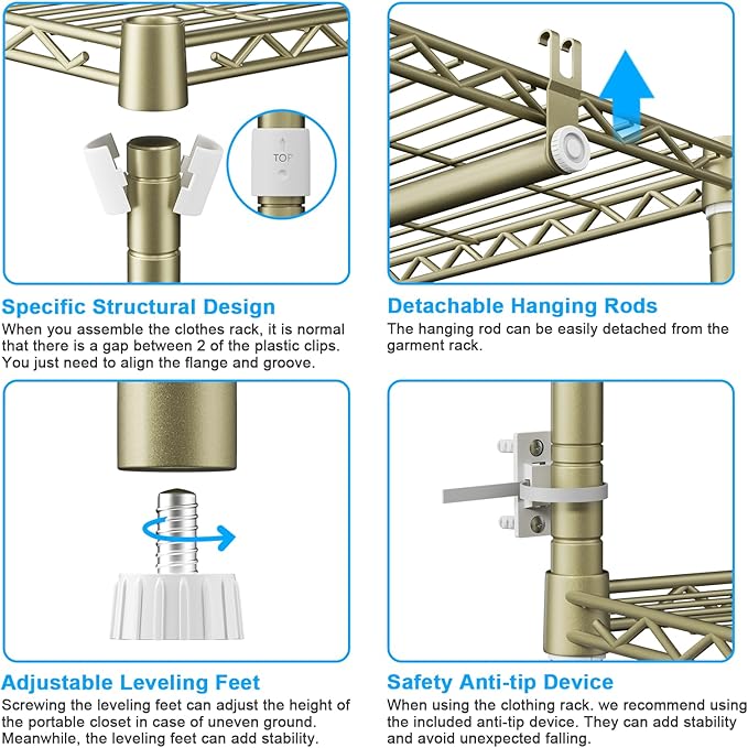 - ▶【STURDY & RELIABLE】Garment rack made of high quality carbon steel,Makes it stable、sturdy and reliable,Not easy to tip over,Portable closets for hanging clothes adopt non-polluting gold coating to protect it from water and rust,Weight Capacity:Total 900lbs ,The middle shelf and 8 S hooks also enhances the stability of the closet organizer system when using!
