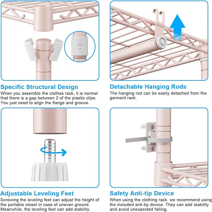 - ▶【STURDY & RELIABLE】Garment rack made of high quality carbon steel,Makes it stable、sturdy and reliable,Not easy to tip over,Portable closets for hanging clothes adopt non-polluting pink coating to protect it from water and rust,Weight Capacity:Total 900lbs ,The middle shelf and 8 S hooks also enhances the stability of the closet organizer system when using!