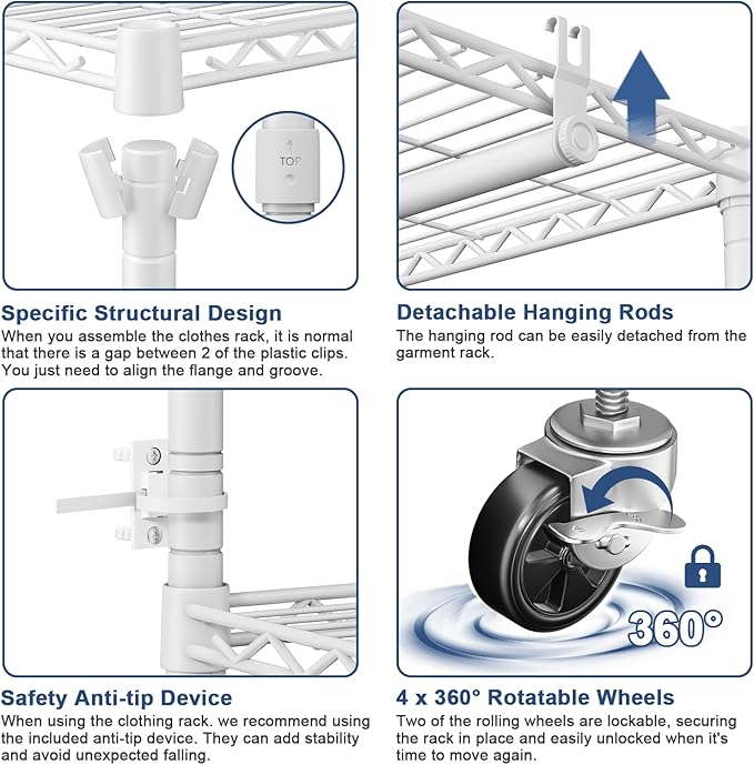 - ▶【PORTABLE & LOCKABLE】Our rolling clothes rack comes with four 360° rotation wheels ,You can take portable clothes rack anywhere you need it,Such as bedroom, laundry room, living room, cloakroom, hallway, clothes store etc,Two of the wheels have locking function,Coupled with the Anti-tip Device to enhance the stability of the portable closet,You will get a flexible closet organizer and storage system,Can be mobile or fixed!