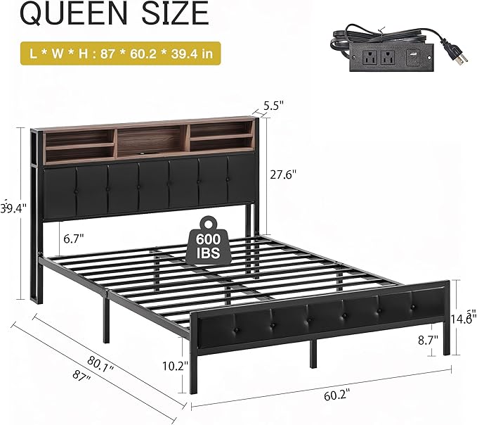 - Stay Powered Up: This bed frames queen is built with a charging station, 2 power outlets and 2 USB ports, keep your tablets, phones, or other electronics powered up