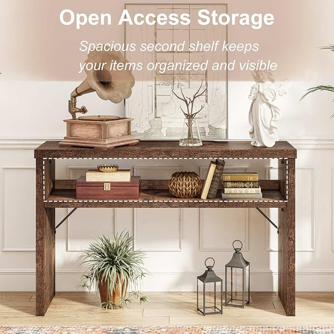 - Two-Tier Entryway Table: This sofa table features a spacious 47" tabletop and an open lower shelf for books, baskets, and decorative pieces. The 2 tier layout offers ample storage while keeping everything visible and easy to access, perfect for use as a console table, hallway table, or behind couch table.