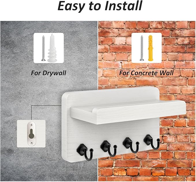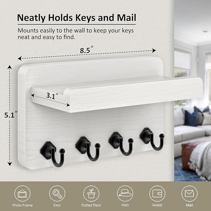 - [SMALL KEY HOLDER] Four sturdy hooks make this small key holder perfect for keys, leashes, handbags, and coats, while the built-in shelf ensures tidy organization of wallets, sunglasses, photo frames and more.