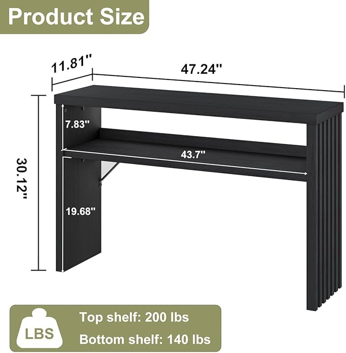 - Two-Tier Entryway Table: This sofa table features a spacious 47" tabletop and an open lower shelf for books, baskets, and decorative pieces. The 2 tier layout offers ample storage while keeping everything visible and easy to access, perfect for use as a console table, hallway table, or behind couch table.