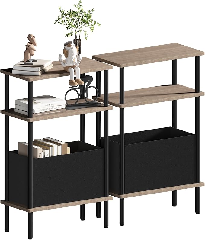 Narrow Side Table with Fabric Basket, Set of 2 End Table for Small Spaces, Slim Nightstand with 3-Tier Storage Shelf, Sofa Beside Table, for Living Room, Bed Room, Natrual Walnut