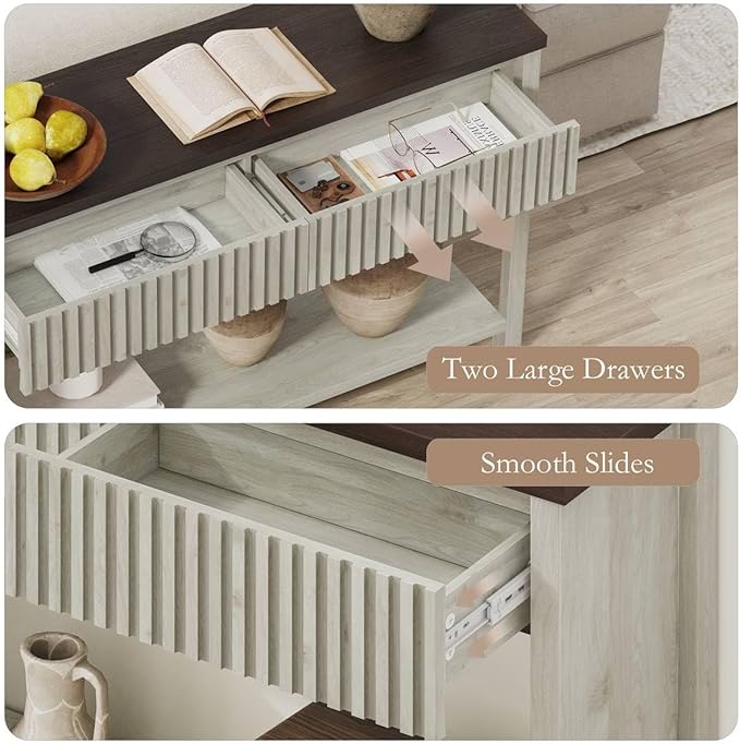 - Storage Drawers & Two-Tier: Keep your space organized with two drawers for clutter-free storage. The two-tier shelves provide versatile storage solutions: the top shelf for decorative items, and the lower tier for baskets, or everyday essentials. Perfect for living rooms, entryways, hallways, or as a display console, this table works beautifully with lamps, books, plants, or décor accents.