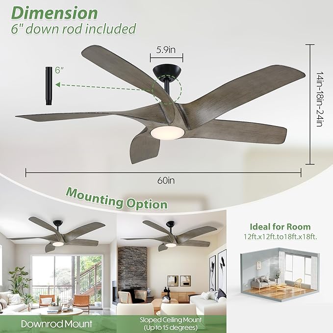 - Easy Installation & Adjustable Mounting:Weighing only 7.37KGS (16.25 lbs)Product Size:60*60*13.14inches, this large ceiling fan requires no ceiling holes, preserving room aesthetics. The included 6-inch rod and 15-degree tilt adapt to sloped ceilings, making installation quick for any space—indoors or outdoor fans for patios. Clear instructions and pre-assembled parts ensure hassle-free setup.