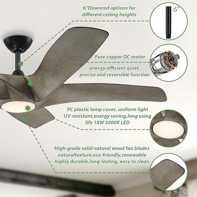 - Large 60-Inch Modern Design & Versatile Use:This large ceiling fan features 60-inch ABS imitation wood grain material,blending rustic farmhouse charm with modern aesthetics (ventiladores de techo modernos). Perfect for indoor spaces like living rooms, bedrooms, or offices, it also functions as a durable outdoor ceiling fan with light for covered patios, porches, and sunrooms. The timeless design complements any decor while delivering powerful airflow.