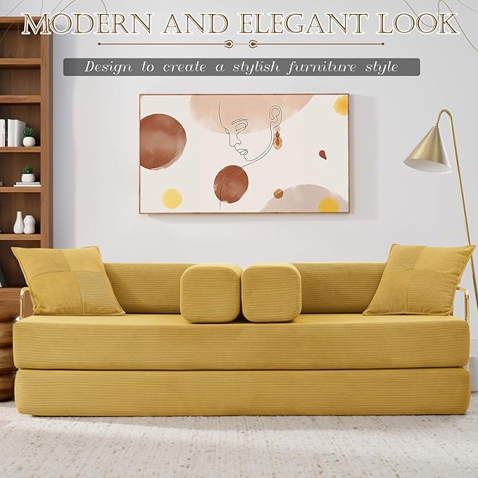 Antetek Convertible Futon Sofa Bed, 3-Seater Modern Corduroy Foam Floor King Size Bed Foldable Sleeper Lounge Loveseat Sofa Couch with 2 Throw Pillows for Living Room Bedroom Guest Room, Yellow