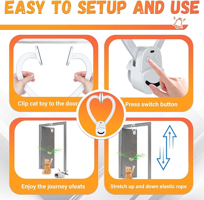 - Cat Interactive Toys Fun – Hanging for Multi-cat stimulation toys for indoor cats Hanging mode (elastic string + cat flying bird toy) to prevent boredom. cat entertainment for indoor cats, exercise, and reducing destructive behavior in indoor cats-cat enrichment toys for indoor cats. Hanging bird toy for cats is suitable for kittens and adult cats. The automatic cat toy for doorway stimulates cats' hunting instincts and agility.