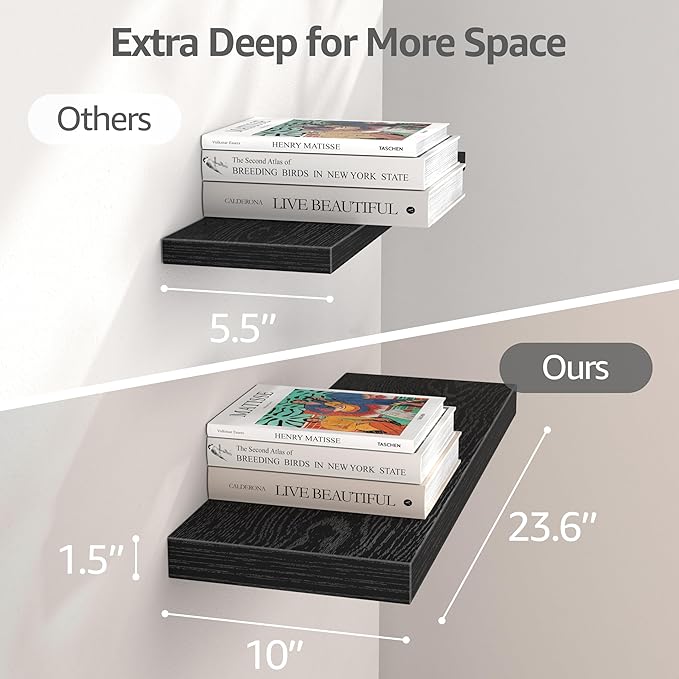 - 10" Depth: 10"D x 23.6"W x 1.5"H. 10" depth suitable for books, basket, toilet paper or bath towels. Contains 3 shelves perfect for large space and freedom combination