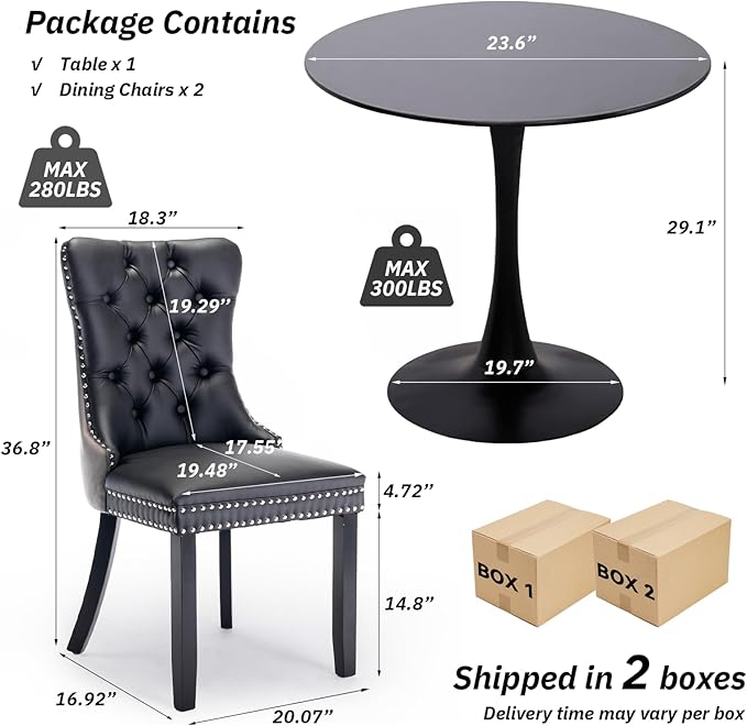 - 【Product Information】Dining Chair Dimensions (L x W x H): 19.7" x 24.4" x 37.5", Maximum Weight Limit: 260 lbs; Dining Table Dimensions(L x W x H): 23.6" x 23.6" x 29", Maximum Weight Limit: 150 lbs. The dining table set needs to be easily assembled within 40 minutes, all assembly screws and stool are included in the package.