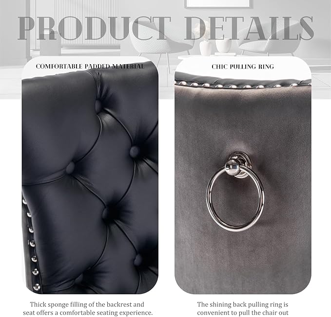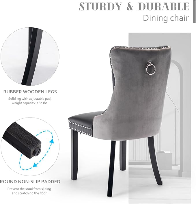 - 【Dining Chair Material】The accent dining chair is upholstered in leather and velvet for comfort and elegance. The frame and legs of the chair are made of rubber wood, which provides enough safety to hold up to 250 lbs. The seat cushion has a bi-elastic structure with high-rebound foam to provide you with a comfortable seating experience. There are small anti-scratch feet on the bottom of each leg to prevent damage to the floor.