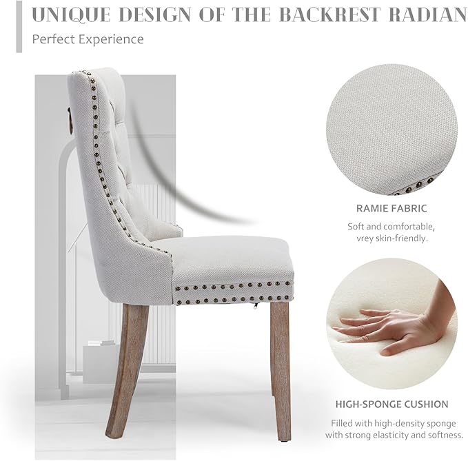 - 【Dining Chair Material】The accent dining chair is upholstered in linen for comfort and elegance. The frame and legs of the chair are made of rubber wood, which provides enough safety to hold up to 250 lbs. The seat cushion has a bi-elastic structure with high-rebound foam to provide you with a comfortable seating experience. There are small anti-scratch feet on the bottom of each leg to prevent damage to the floor.