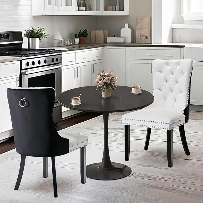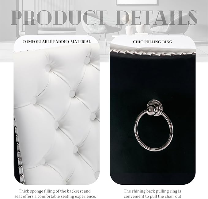 - 【Dining Chair Material】The accent dining chair is upholstered in leather and velvet for comfort and elegance. The frame and legs of the chair are made of rubber wood, which provides enough safety to hold up to 250 lbs. The seat cushion has a bi-elastic structure with high-rebound foam to provide you with a comfortable seating experience. There are small anti-scratch feet on the bottom of each leg to prevent damage to the floor.