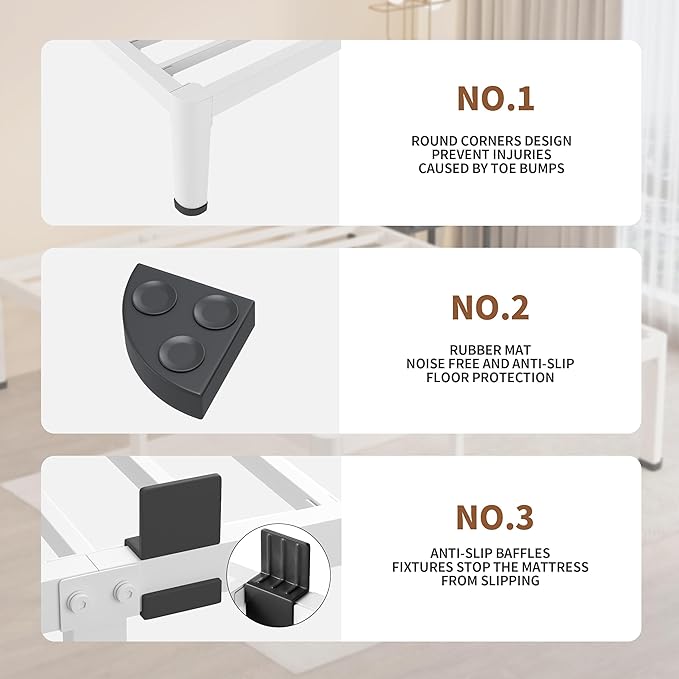 - Special Feature : Rounded Corners, Mattress Slide Stopper, Anti-slip Rubber Gaskets, Heavy Duty Metal, Steel Slat Support, No Box Spring Needed, Easy Assembly Rounded Corners, Mattress Slide Stopper, Anti-slip Rubber Gaskets, Heavy Duty Metal, Steel Slat Support, No Box Spring Needed, Easy Assembly
