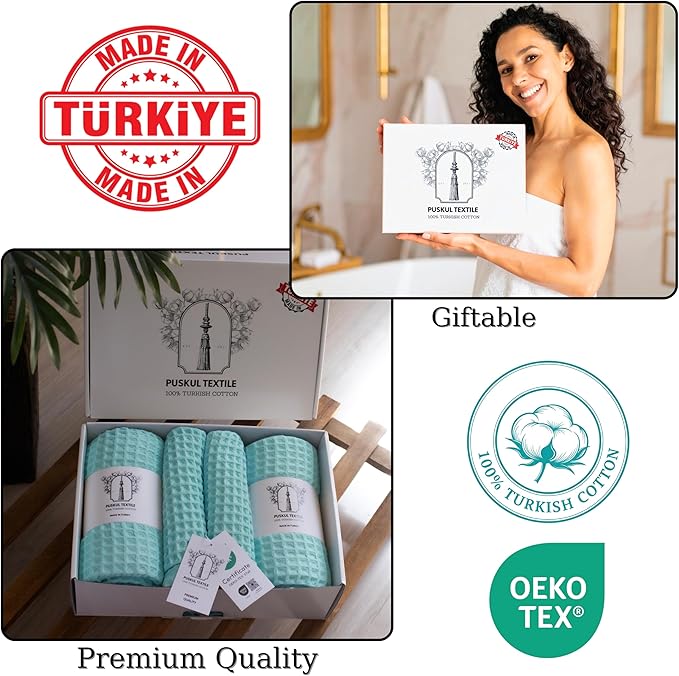 - 🔹PURE 100% TURKISH COTTON: Experience the natural comfort and incredible feel of our luxurious Puskul Tekstil waffle weave Turkish towels, crafted from organic 100% Turkish cotton. 🔹MADE IN TURKEY: Experience the difference of genuine Turkish mastery. Every Puskul Tekstil premium quality Turkish cotton waffle towel set is meticulously made in Türkiye under strict OEKO-TEX Standards, showcasing high-quality craftsmanship from its rich Turkish heritage