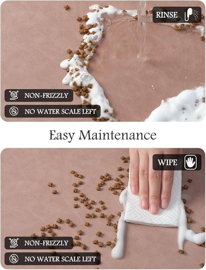 - Keep Clean & No Stains:No marks will be left when food and water are dropped on the dog food mat. Unlike traditional silicone pet feeding mats, our pet feeding mat for food and water won't pick up pet hair or dust, and won't build up tough-to-clean limescale, keeping the dog bowl mat as good as new forever.