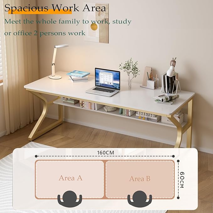 Extra Long Desk with Bookshelf - 63" Double Long Writing Table for 2-Person Workstation, Modern Study Work Computer Desk for Home and Office, Gold