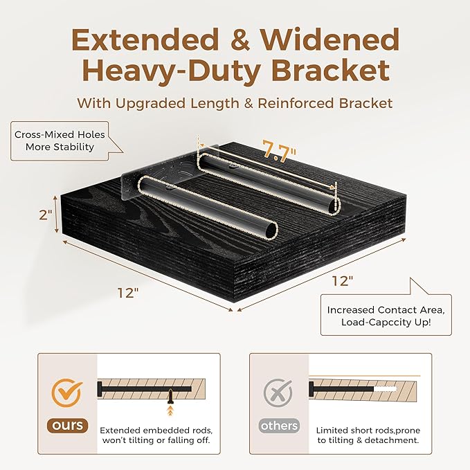 Fun Memories 12 Inch Floating Shelf, Rustic Wood Wall Shelves for Wall Decor & Storage, 12 x 12 Floating Shelf for Living Room, Bathroom, Bedroom, Black, Set of 2